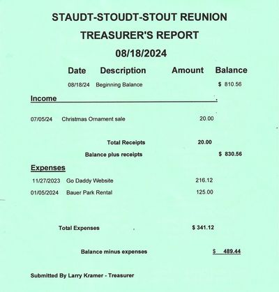 Donations were appreciated by John Baker, Lee Ellen Conley, Shelby Hoggatt, Rev. Dr. Robert S. Stoudt, Carl Stout, Marvin Stout, Bert and Janet Stout Toms, and Lorrie Stout Ward.